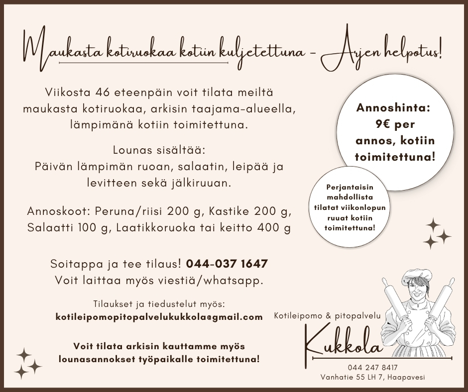 Mehän myös toimitamme ruuan muualle ja tarvittaessa tulemme myös tarjoilemaan, kysy tarjous :) kotileipomopitopalvelukukkola@gmail.com