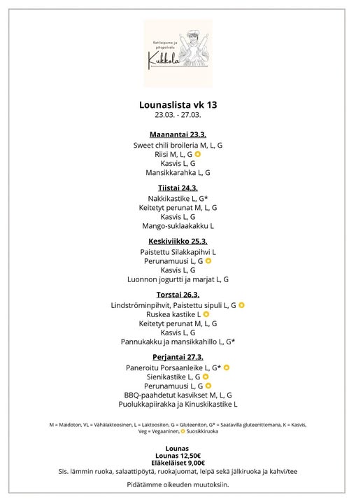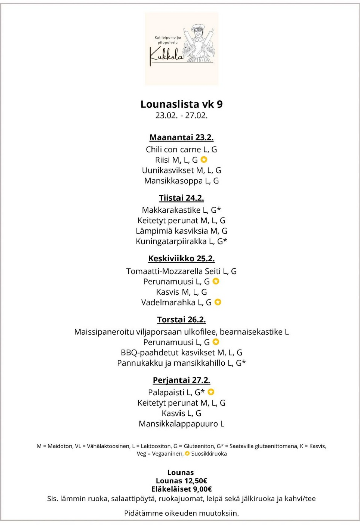 Lounaan hinta: 12,50 € - Eläkeläiset: 9 € - Lapset: 1 ikävuosi 1€